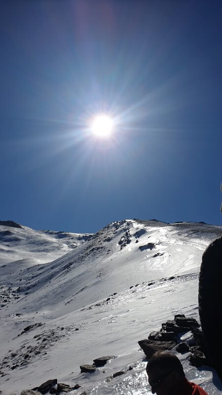 Voor de volgende dag gaan we naar de noordzijde van de Sierra Nevada om op een andere unieke manier te wandelen. En wel in de sneeuw van la Veleta. Voor deze gelegenheid lopen we met raquetas, speciale sneeuwschoenen, door de sneeuw. Onze professionele gids, Jesús, neemt ons mee naar de prachtigste plekjes op de sneeuwhellingen van deze berg die zich met haar 3396 meter, de één na hoogste berg van het vasteland van Spanje mag noemen. Puur genieten van de hoogte en de schitterende sneeuwvlaktes.